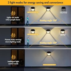 ✔ 1200mAh larger powerful solar motion sensor lights is made of IP65 waterproof ABS material with 3 intelligent lighting modes, providing continuous lighting for 6 to 12 hours.