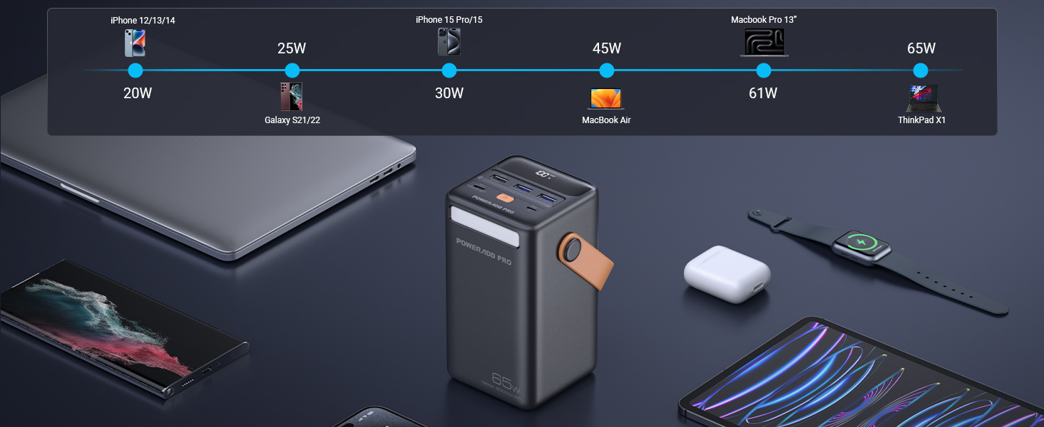 ⚡ 65W PD Fast Charging for Laptops & Phones – Equipped with a USB-C PD 65W output, this high-capacity power bank can fast-charge laptops such as MacBook Pro, as well as tablets and smartphones. Charge a MacBook Pro up to 50% in just 30 minutes.