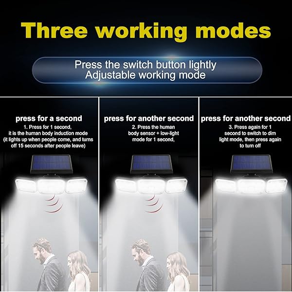 3 Lighting Modes & 270° Adjustable Angle: There are 3 lighting modes to meet your different needs. Mode 1 turns on at 100% brightness when motion is detected within its sensing range and turns off 30 seconds after people leave. Mode 2 is at 100% brightness when motion is detected within its sensing range, and always on at 10% brightness 30 seconds after people leave. Mode 3 always stays on at 30% brightness at night and will not detect any motion or turn off automatically. The solar security light has a lighting angle of up to 270°, providing bright and broad illumination for your yard, garage, pathway, etc.
